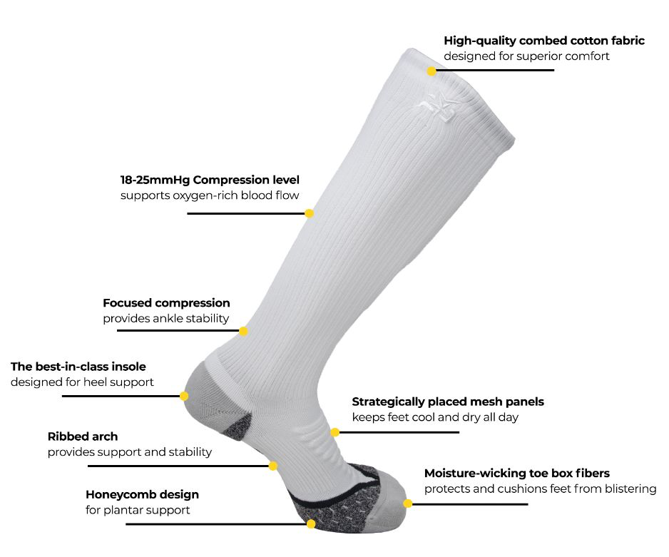 - 18-25mmHg Compression level supports oxygen-rich blood flow.