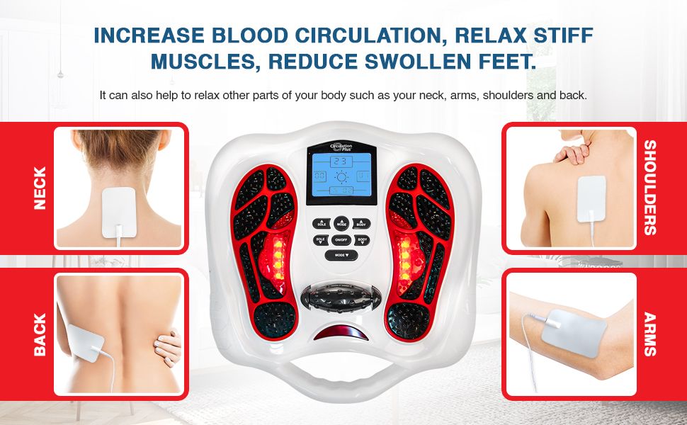 The Circulation Plus is designed to send microcurrent electrical pulses, instead of vibrations, through the soles of your feet, which stimulates nerves and increases blood flow to help reduce pain and swelling. After placing bare feet upon the footpads, you can use the main display or included remote control to slowly increase the intensity of the EMS therapy from 0 to 99, until you begin to feel comfortable stimulation. There are 25 waveform massage modes to choose from, with Modes 1-8 intended to stimulate healthy muscles and improve muscle performance. Modes 9-25 temporarily help relieve pain associated with exercise and normal activities. Additionally, the targeted therapy electrode pads can help ease muscle aches in your upper and lower back, shoulders, arms, hips, legs, waist, and more.