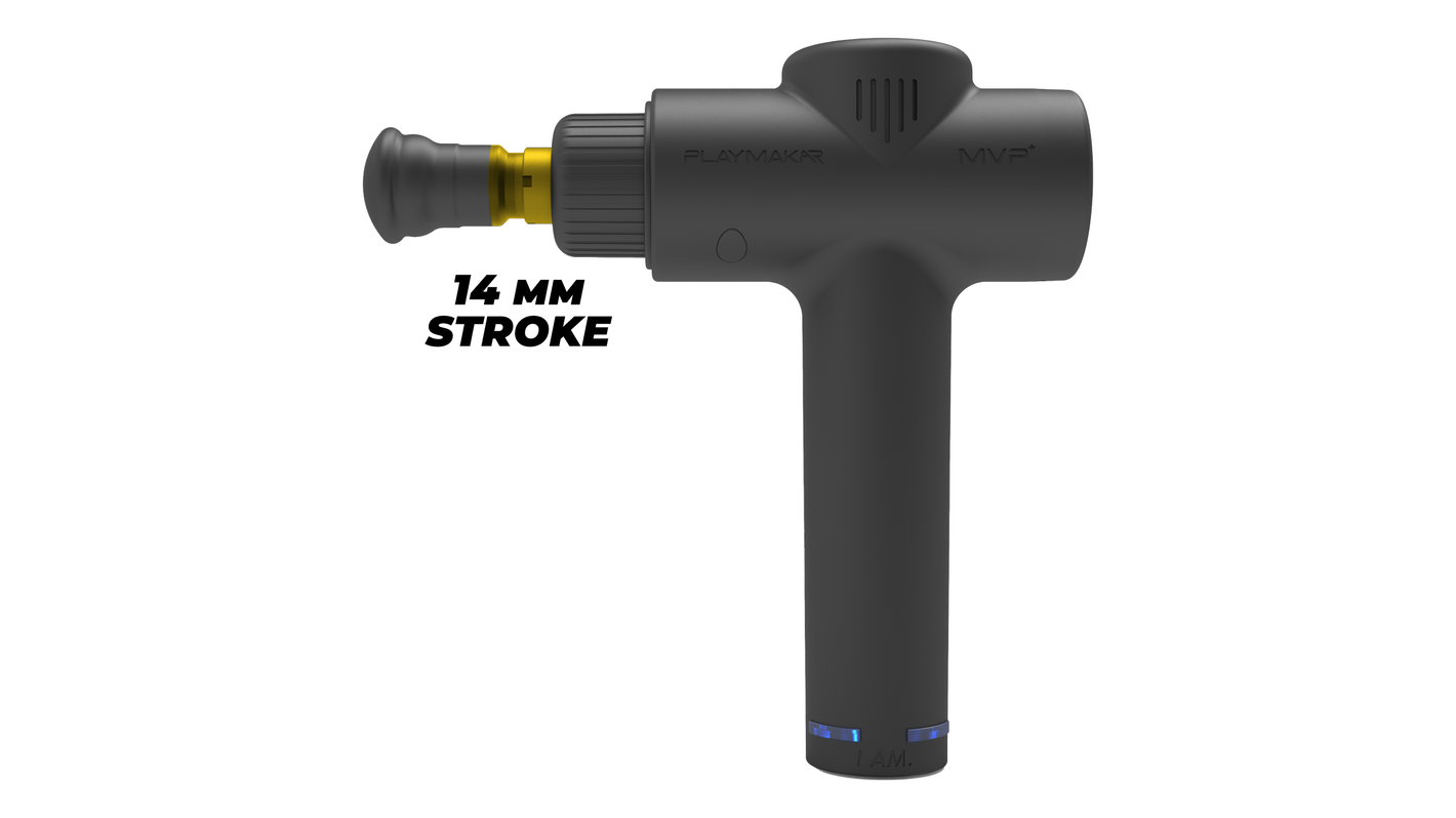 A 14mm stroke length simulates deep tissue treatment commonly used in massage therapy to promote healing and reduce musculoskeletal pain occuring from sports injuries. Stroke length describes how deep the massage head extends and retracts into the body tissue.