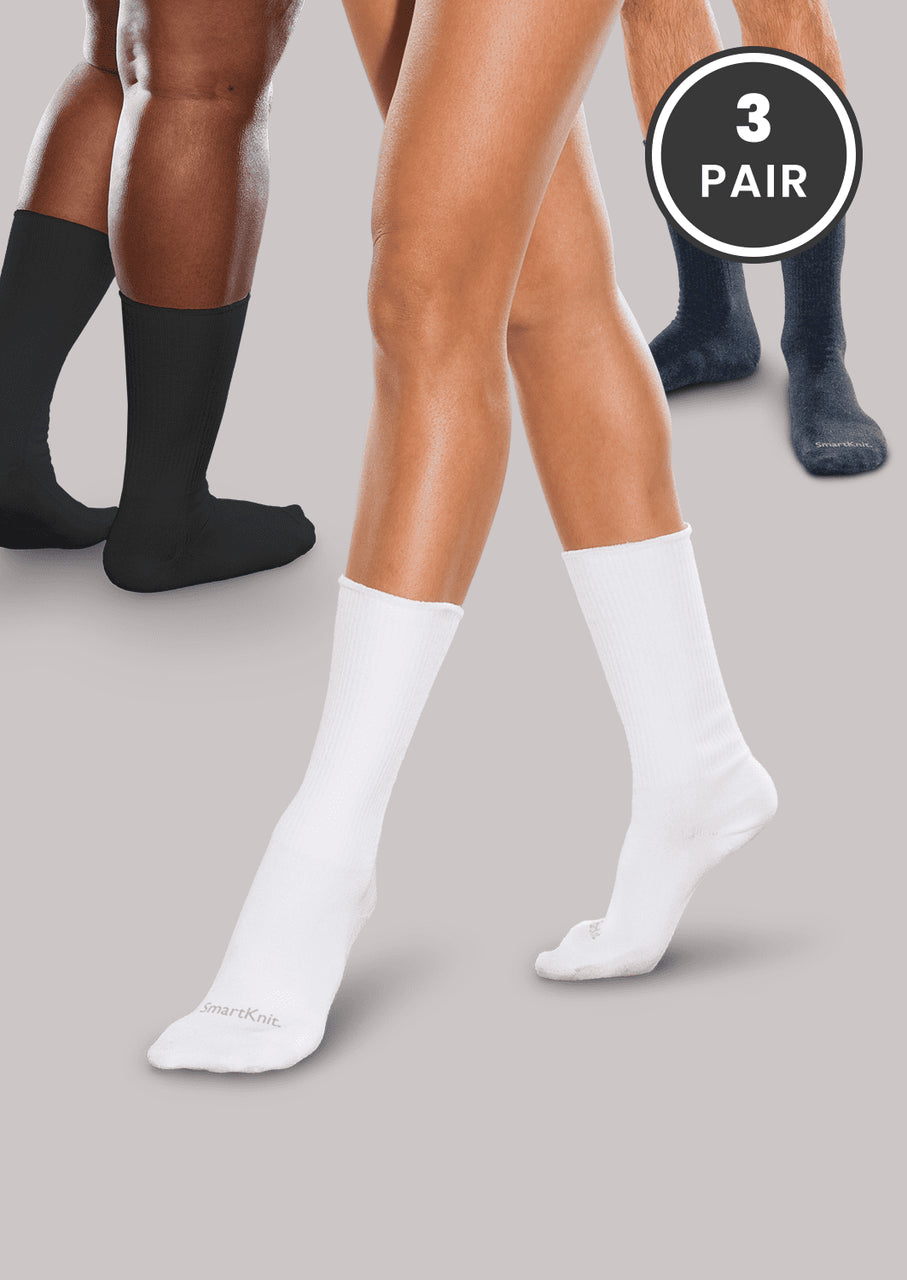 SmartKnit Seamless Crew Socks – 3 Packs are recommended for people with diabetes, arthritis, sensory processing disorder, or any condition where protection from irritation is important. The sock is a middle level style with a length that ends at the mid-calf. This mixed pack provides one pair in each color, black, white, and navy.