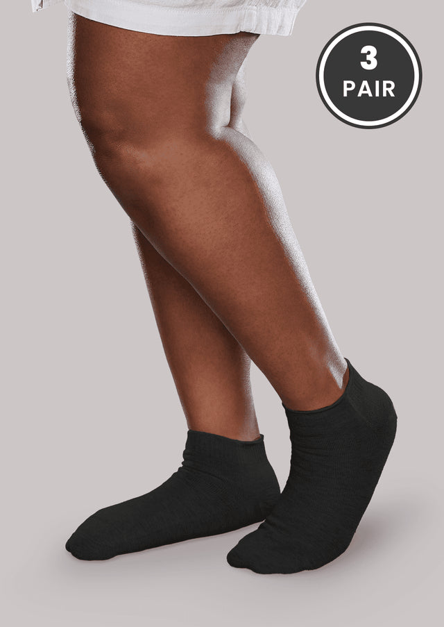 SmartKnit Seamless Mini Crew Socks for Adults – 3 Pack are recommended for people with diabetes, arthritis, sensory processing disorder, or any condition where protection from irritation is important. The short length makes a perfect ankle sock. This pack includes three pairs of the same color, black or white.